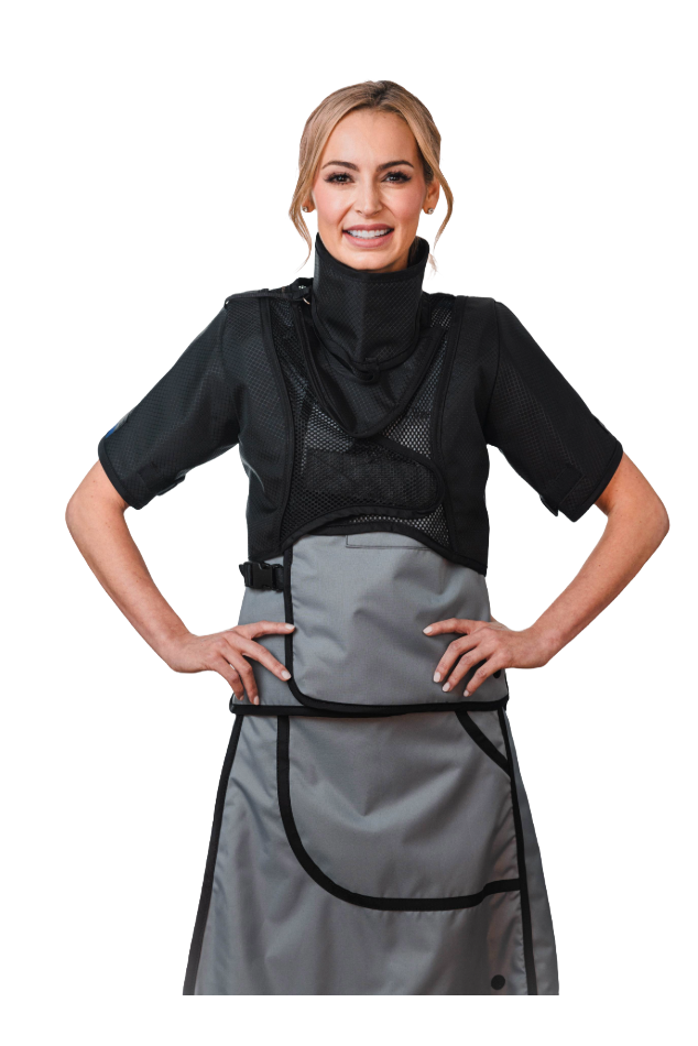The BAT™ is designed to reduce the risk of breast cancer and other radiation-associated cancers in healthcare professionals. It seamlessly integrates with existing gear and offers superior universal shielding for potential gap areas and sleeves. This versatile accessory can be worn over or under a current radiation protection apron, enhancing safety and providing added assurance, especially for community aprons in hospital settings. Featuring .35mm Xenolite 800 NLE protection in the main body, sleeves, and breast plate, the BAT ensures comprehensive coverage. The attached thyroid shield offers 0.5mm protection to safeguard sensitive thyroid tissue. An adjustable hook and loop closure allows for a custom fit, including sleeve adjustments, ensuring comfort and optimal protection for every user.