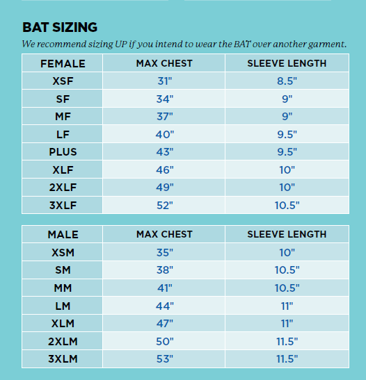 For the best fit and comfort when wearing the BAT over another garment, we recommend sizing up. For accurate sizing, please consult the sizing chart located below the photo.