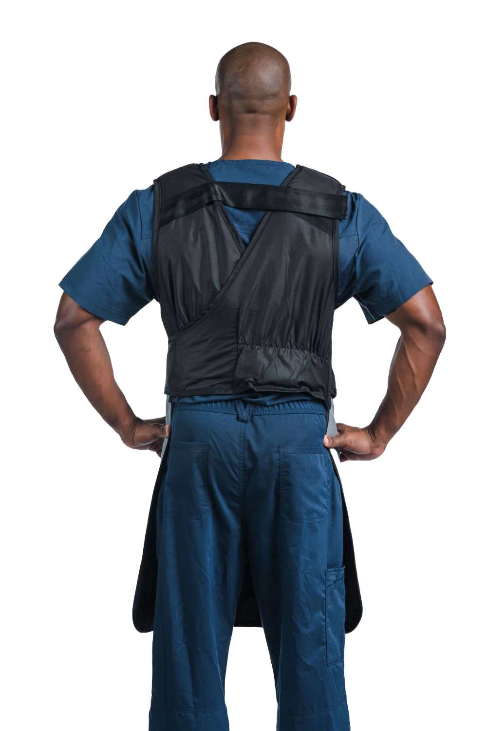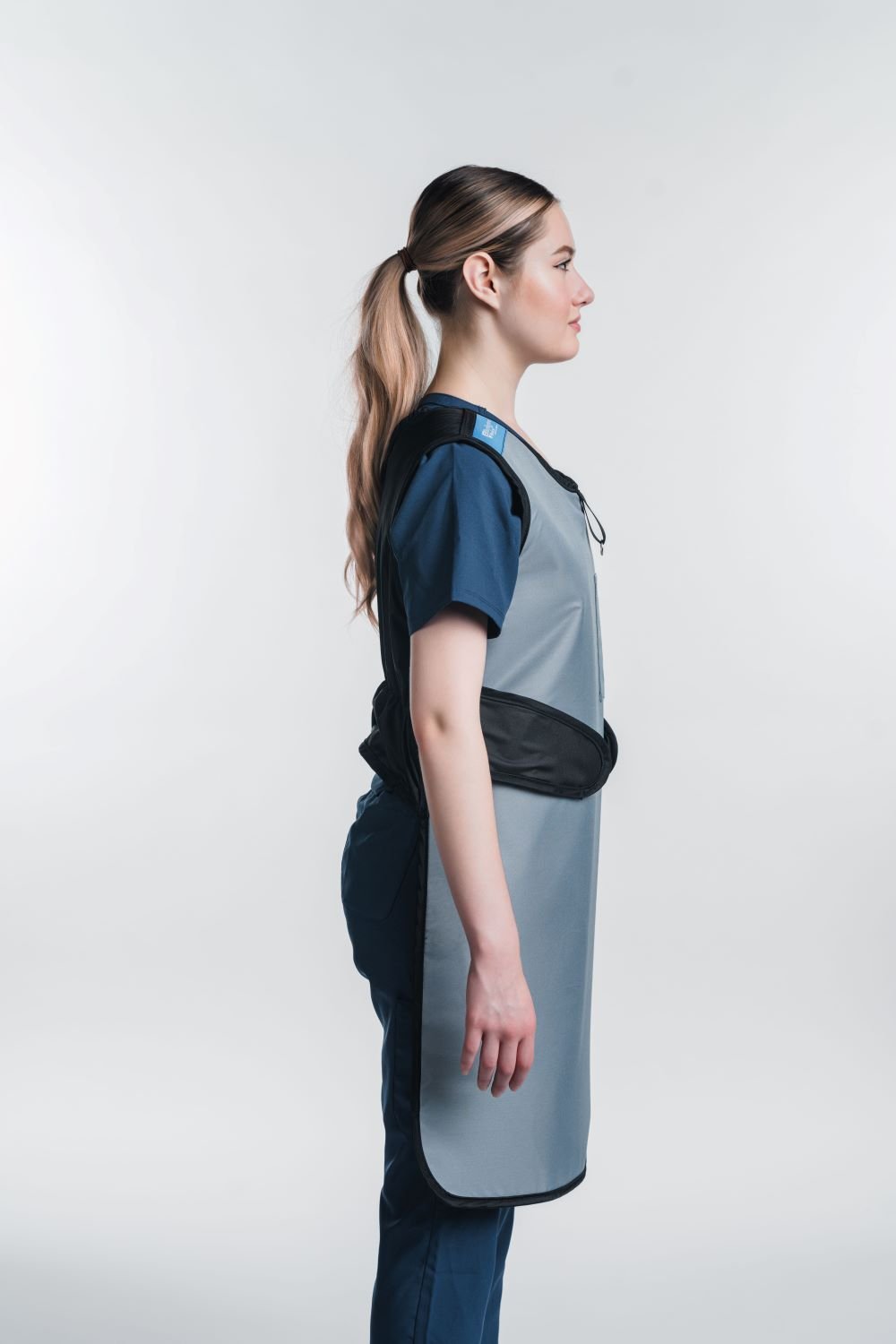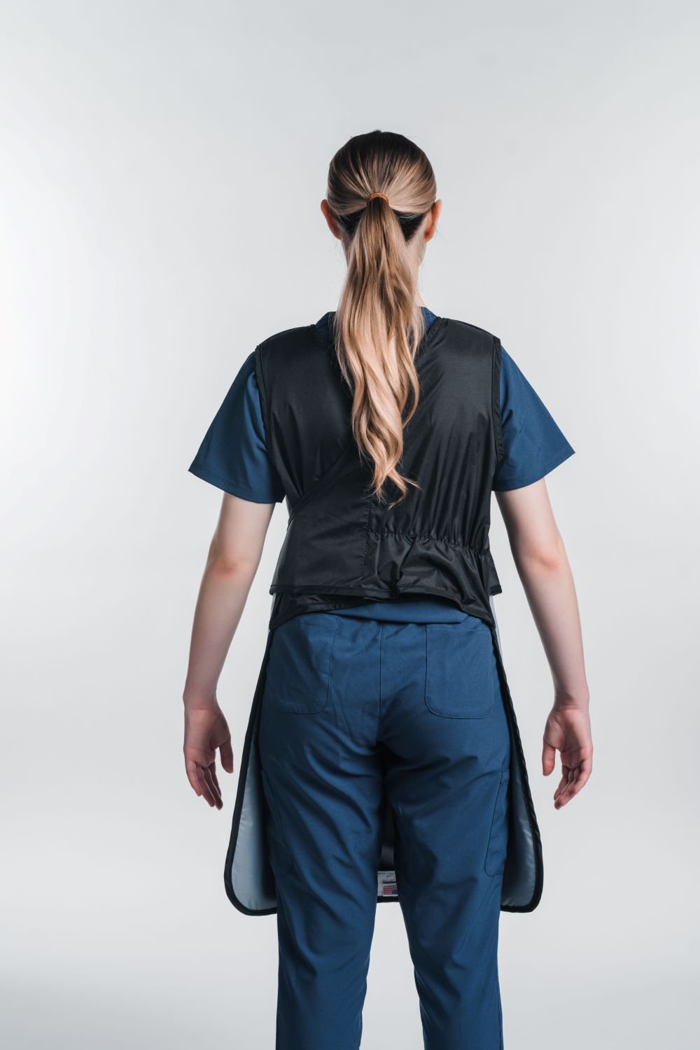 The F17 is a great option for those who don't turn their back to the source and need a lightweight, simple apron. This model offers frontal protection with a crisscross stretch back and comfort foam shoulder padding. The stretch closure provides greater weight distribution between the shoulders and back, making this apron one of our easiest to put on. An optional hook and loop F15 strap can be added as shown in the last photo.